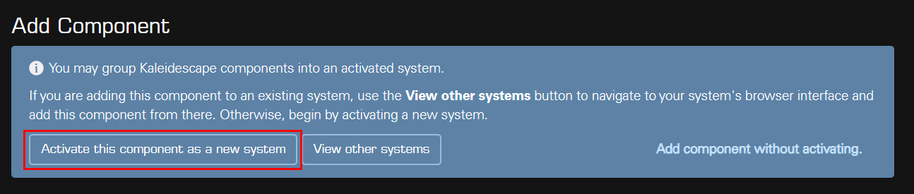 Mini Terra Prime can either be activated as a new system or added to an existing system. Refer to the appropriate section below. For full details about system activation and walkthroughs of the activation methods, refer to the Kaleidescape System Activation support article.