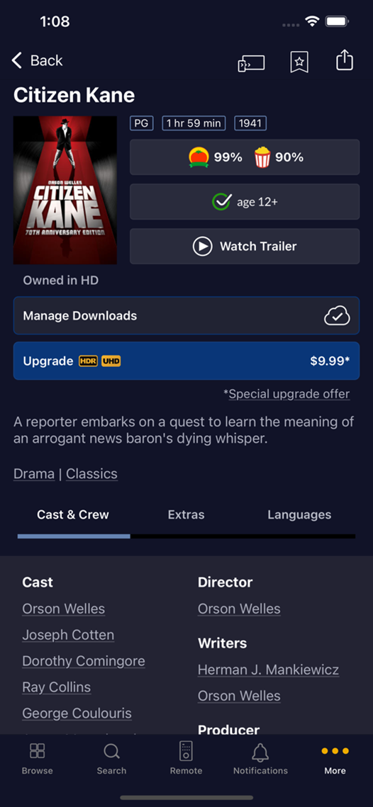 If you already own a version of a movie, either on disc or purchased from Kaleidescape, special pricing is sometimes offered when you convert from disc to digital download or upgrade the quality to a higher-quality version (e.g., from a Kaleidescape HD download to a 4K download).