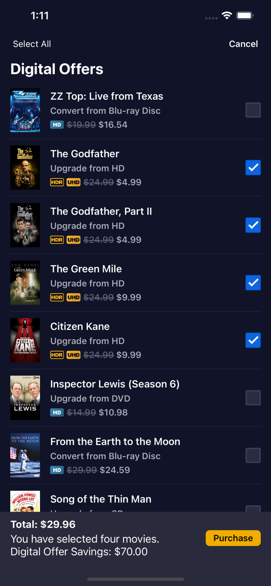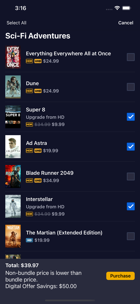 But what if we de-selected one of the other titles? Now we can see that the store is actually charging more for that movie than you would pay with the digital offer. What’s going on here?