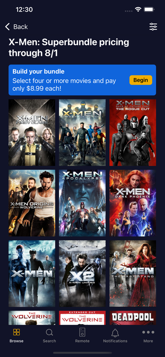 From time to time, working with our studio partners, Kaleidescape offers promotional bundles in which you can qualify for special pricing when you purchase at least a certain number of titles. These bundles appear in the mobile app as special collections, where a bright blue banner is shown above the grid of movies that explains the terms of the offer. Tap the Begin button to begin selecting titles. The summary area at the bottom shows your progress towards qualifying for the bundle.