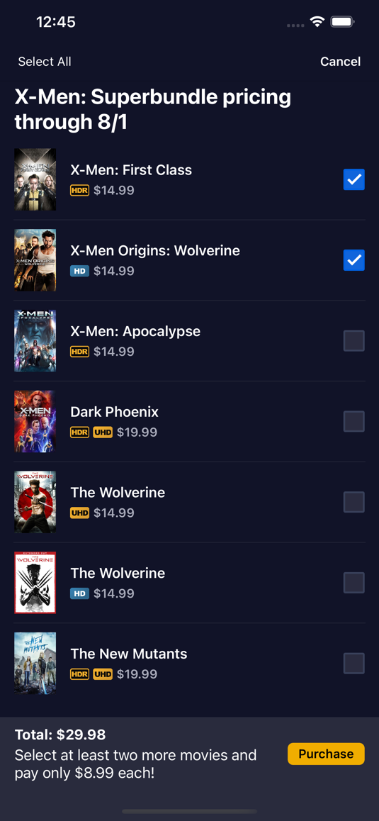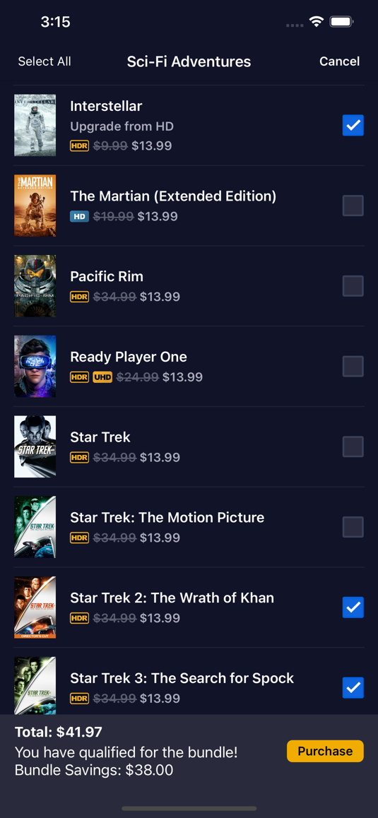 Once you have qualified for the bundle, you will see all of the original prices of the movies struck through, and the bundle price is shown. This reinforces the fact that you have qualified for the bundle, and are now paying the reduced price for each movie selected.