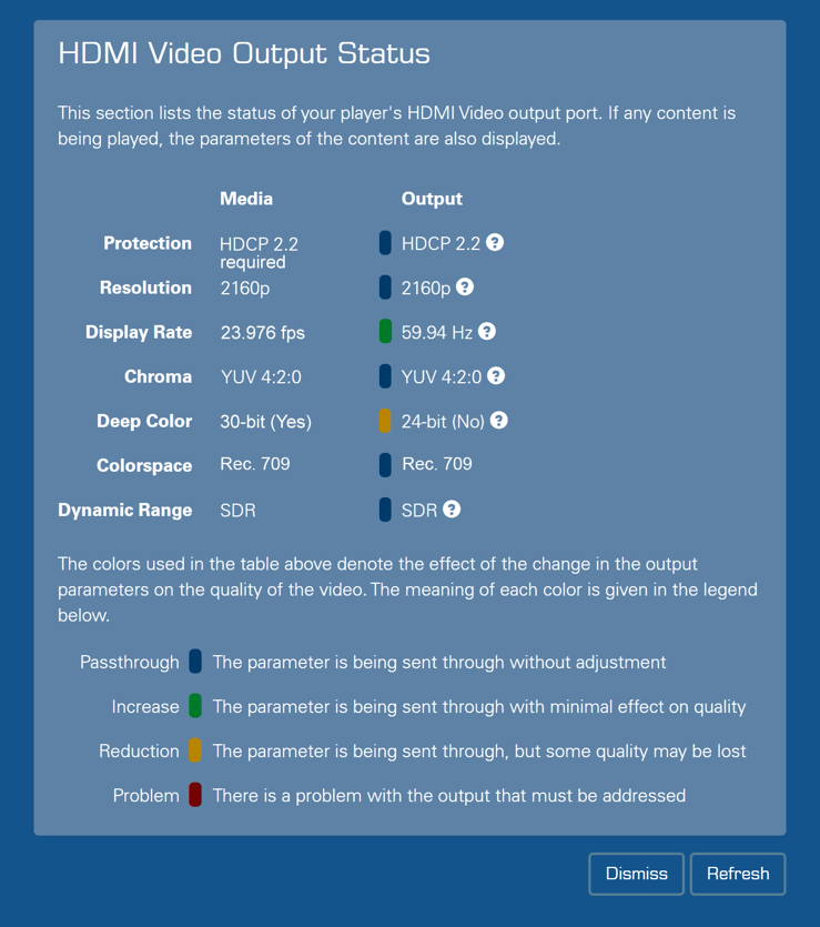 This section shows the output status of the HDMI port, as of when the window was opened or refreshed. It works when displaying the onscreen display, and while playing content, so you can use it to confirm that 4K Ultra HD content is being displayed at full resolution, that 1080p content is being up-scaled, and that the expected frame rates and color information are being output.