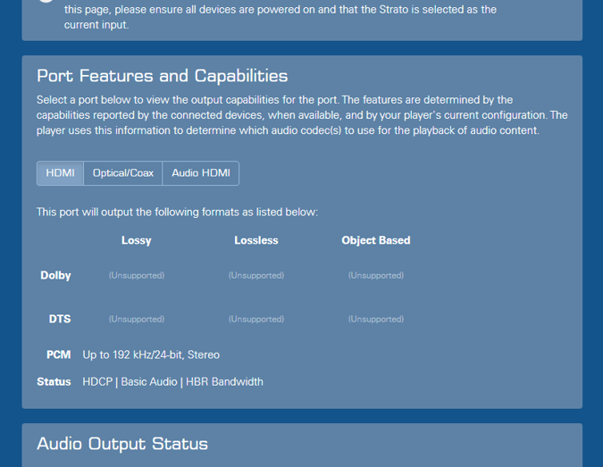 The Audio Ports section at the top of this page shows a visual representation of the rear ports of the player. It will show when an audio port is active, in standby, or unplugged. In the cases of the coax and optical ports, they will always show as active regardless of whether connected to anything or not. The state of the port is important as the reported capabilities of the port may be dependent on its current state.