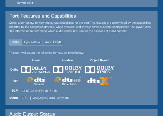 The Audio Output Status shows the original format of the playing media along with what is currently being output by each port. In the above example, the media is multichannel DTS-HD Master Audio but the player is directly connected to a display that is only capable of stereo PCM.