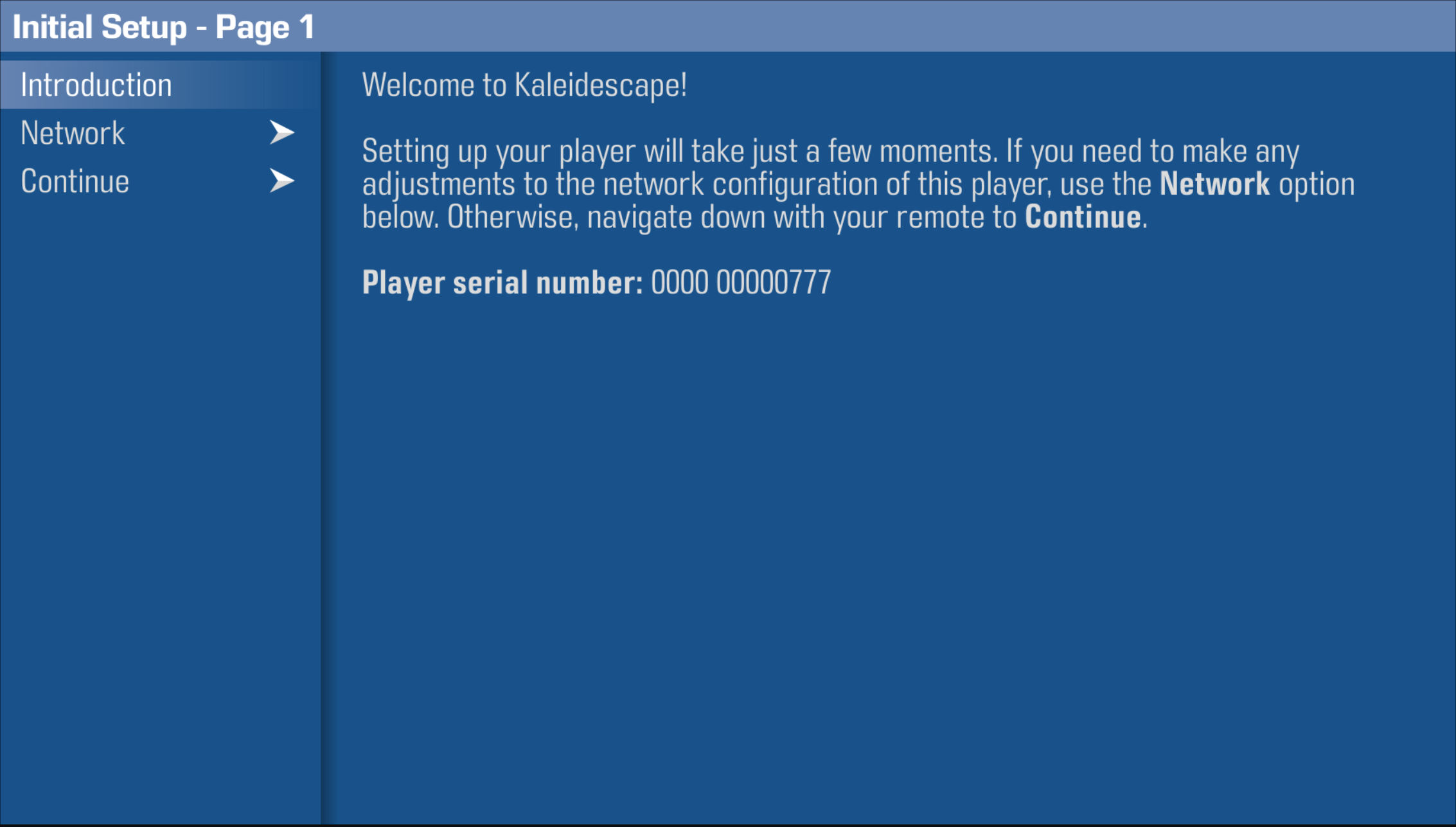 After making the HDMI and network connections, make sure your display device is set to the correct HDMI input, then connect Strato E’s AC adapter. You should see the Kaleidescape logo on the display, and after a few minutes, the initial setup menu appears.