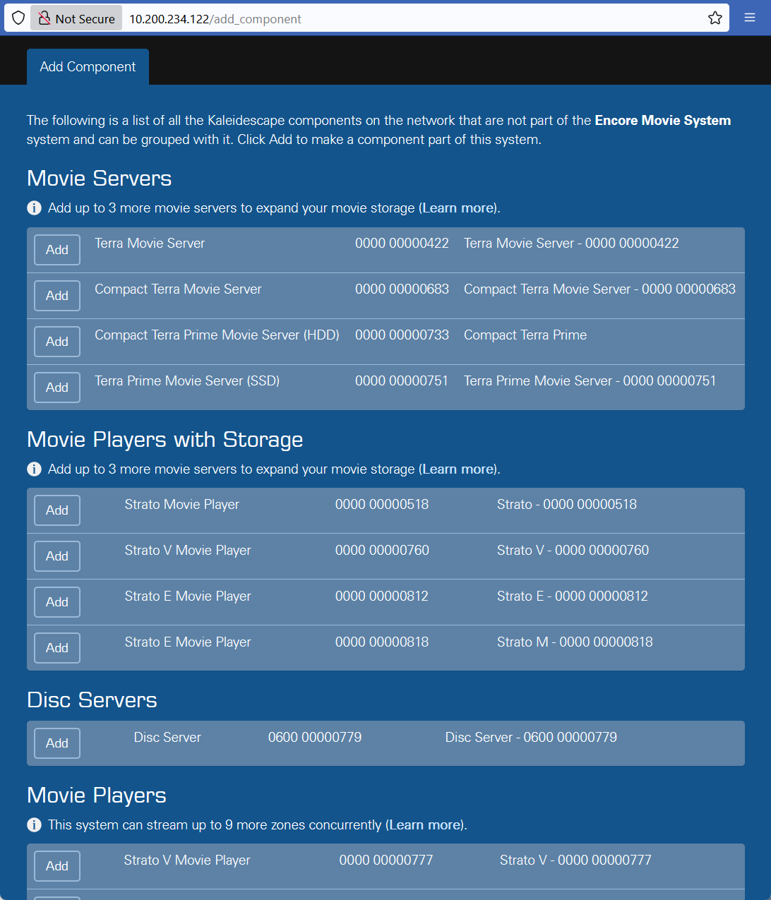 The Add Component page lists all components found on the network. Click the Add button beside the Strato E you wish to group with the Terra. Note that a Strato E operating in standalone mode will be listed in the “Movie Players with Storage” section of the component list.