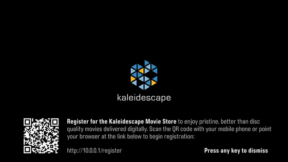 Toggle the standby button on the Strato E’s remote if necessary and begin the activation process by scanning the QR code on the screen using a mobile phone that is connected to the same network as your Kaleidescape system or pointing your web browser at the link address presented at the bottom of the screen.