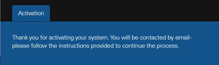 Note: For testing and calibration purposes, installers can skip the activation step by selecting Finish despite this option appearing unavailable. The system will need to be activated later so that the customer can use it.